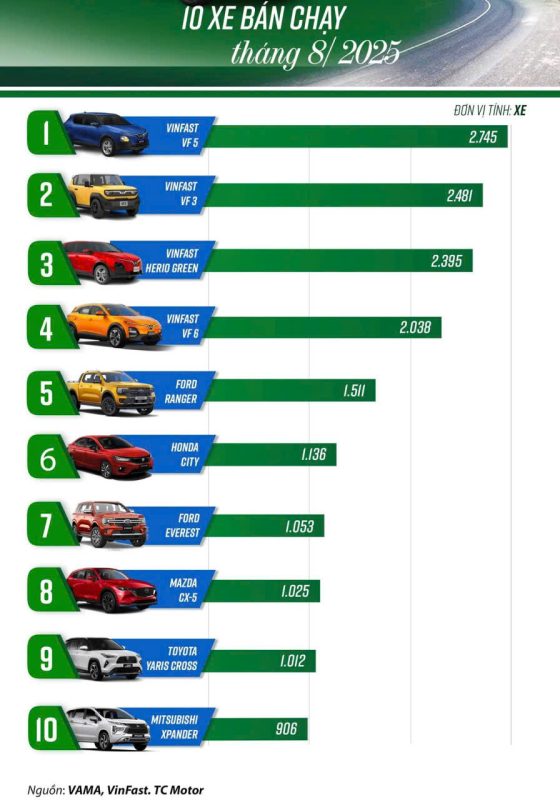 Trong danh sách 10 mẫu ô tô bán chạy nhất Việt Nam trong tháng 8 thì 4 vị trí đầu vẫn thuộc về các mẫu ô tô thuần điện của VinFast. Ba trong số đó ghi nhận doanh số tăng trưởng. 6 mẫu xe xăng/dầu còn lại đều ghi nhận sức tiêu thụ sụt giảm.